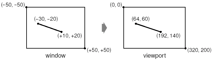 По-умолчанию координаты области просмотра и окна совпадают с системой координат физического устройства. Например, если устройство отображения представляет из себя виджет, с размерами 320 X 200, то и область просмотра и окно имеют те же самые размеры. В данном случае логическая и физическая системы координат совпадают.