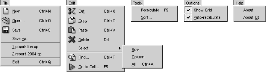 В Qt все меню являются экземплярами QPopupMenu. Мы создали меню "File" и затем добавили в него пункты "New", "Open", "Save", "Save As" и "Exit". Перед пунктом "Exit" добавлен разделитель, чтобы визуально отделить его от остальных. Цикл for инициализирует recentFileIds -- массив файлов, открывавшихся недавно. Мы еще вернемся к этому массиву, когда приступим к рассмотрению реализации слотов меню "File" в следующем разделе.