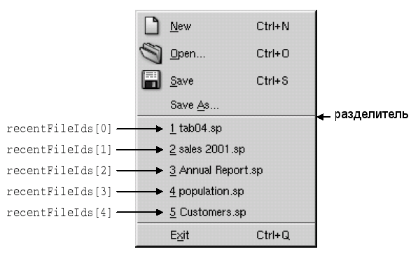 где text -- это текст, который будет отображаться, в данном случае мы используем имя файла без пути к нему. Можно было бы использовать полное имя файла, но это сделает панель меню слишком широкой. Если у вас возникнет необходимость сохранять в меню полный путь к файлу вместе с его именем, то рекомендуем оформлять список файлов в виде подменю.