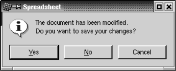 Функция maybeSave() выводит перед пользователем диалоговое окно с запросом (см. рис. 3.8). Диалог имеет три кнопки -- три варианта ответа: "Yes", "No" и "Cancel". Модификатор QMessageBox::Default назначает кнопку "Yes" -- кнопкой по-умолчанию. Модификатор QMessageBox::Escape связывает кнопку "No" с клавишей Esc.