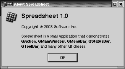 QMessageBox::about(this, tr("About Spreadsheet"),