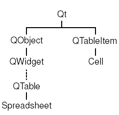 Атрибуты ячейки в QTable, такие как текст и выравнивание, хранятся в элементе QTableItem. В отличие от QTable, класс QTableItem не является виджетом и предназначен исключительно для хранения данных. Класс Cell порожден от QTableItem. В дополнение к атрибутам родительского класса, он имеет возможность хранить формулу вычисления содержимого ячейки.