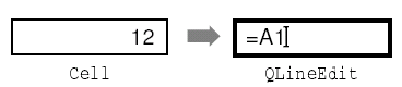 данные игнорируются.createEditor() создает объект класса QLineEdit и записывает в него содержимое ячейки, если initFromCell содержит значение true. Мы выполнили повторную реализацию этой функции для того, чтобы показывать формулу ячейки вместо ее содержимого.