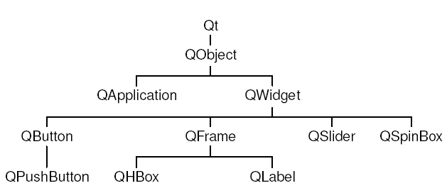 Ссылки в разделе "API Reference" дают возможность навигации по классам различными способами. Так например, перейдя по ссылке "All Classes" вы получите список всех классов библиотеки. По ссылке "Main Classes" -- только самые основные классы. В качестве упражнения попробуйте найти описания классов и функций, использовавшихся в нашем приложении. Обратите внимание: наследуемые методы описываются в базовых классах, например, описание класса QPushButton не содержит метода show(), поскольку он наследуется от класса QWidget. На рисунке ниже приводится диаграмма наследования для классов, использованных в нашем приложении: