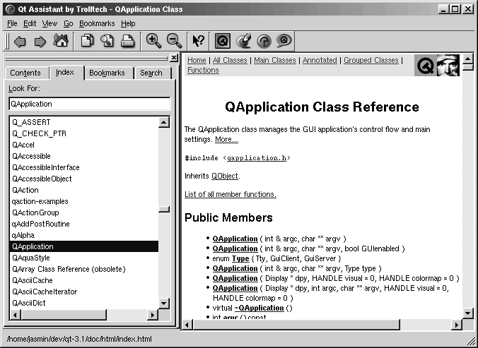 Документация хранится в каталоге doc\html в виде html-файлов. Для ее просмотра может использоваться любой web-браузер. Но Qt имеет свою утилиту просмотра документации -- Qt Assistant, которая предоставляет очень удобный способ навигации по справочнику, гораздо удобнее, чем этого можно добиться в web-браузере. Чтобы запустить утилиту -- выберите пункт Qt 3.2.x|Qt Assistant в меню "Пуск" операционной системы Windows или дайте команду assistant в Unix.