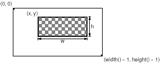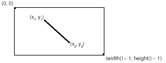 которая принимает координаты в виде двух QPoint.Верхний левый пиксель виджета, в Qt, имеет координаты (0, 0), правый нижний пиксель -- (width()-1, height-1). То есть, по сути, обычная Декартова система координат, с небольшим отличием -- ось OY направлена вниз, что имеет определенный смысл при программировании графического интерфейса. Система координат в QPainter может быть подвергнута таким трансформациям, как трансляция, масштабирование, вращение и сдвиг. Более подробно мы обсудим эту тему в Главе 8.