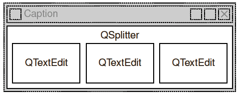 Разделители в Qt реализованы в виде класса QSplitter. Подчиненные виджеты автоматически размещаются друг за дружкой, в порядке их создания, в смежных областях, разделителя. Ниже приводится код, который создает окно, изображенное на рисунке 6.5.