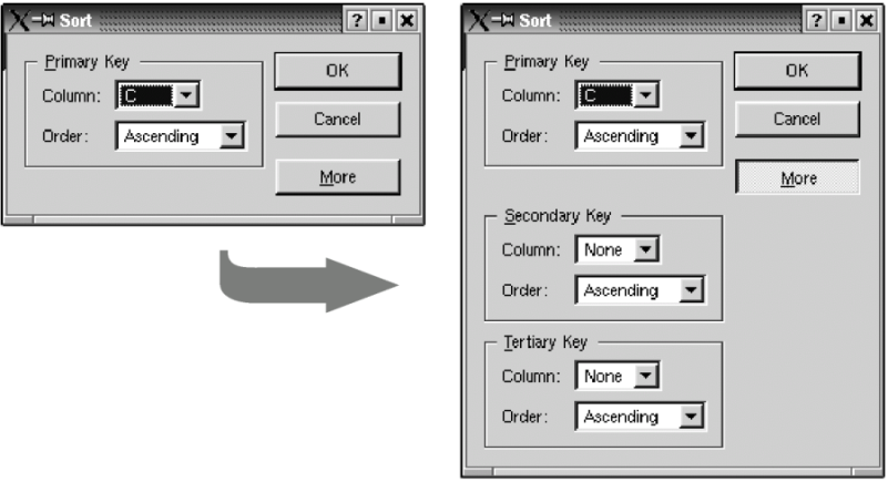 Это диалог сортировки, используемый в электронных таблицах. Он появляется, когда пользователь пытается отсортировать данные по одному или нескольким столбцам. В сокращенном представлении диалог позволяет выбрать столбец и порядок сортировки, в расширенном варианте добавляется возможность указать еще два столбца и порядок сортировки по каждому из них. Кнопка "More" позволяет переходить из сокращенного режима -- в расширенный и обратно.