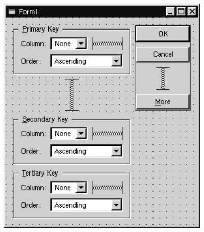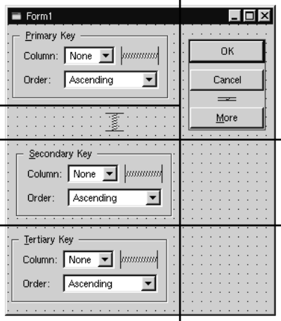Расположите кнопки "OK", "Cancel" и "More" по вертикали. Переместите одну из распорок так, чтобы она встала между кнопками "Cancel" и "More". Выделите все четыре элемента и выберите пункт меню Layout|Lay Out Vertically.