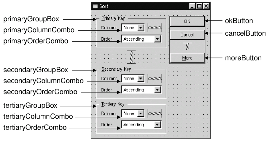 Дайте форме имя "SortDialog" и установите свойство caption в "Sort". Дайте имена виджетам, в соответствии с рисунком 2.16.