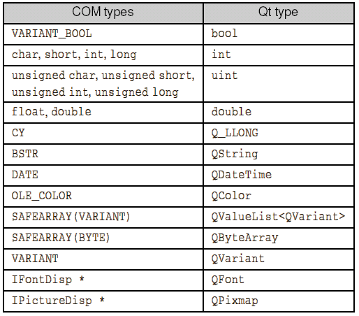 Типы COM автоматически конвертируются в соответствующие типы Qt, в соответствии с таблицей, приведенной на рисунке 18.4. Так например, входной параметр типа VARIANT_BOOL преобразуется в тип bool, а выходной VARIANT_BOOL -- в bool &. Если результатом преобразования является класс Qt (QString, QDateTime и т.п.), то входной параметр получает тип константной ссылки на этот класс (например const QString &).