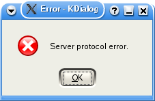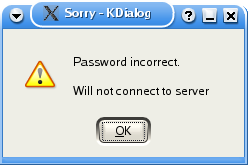 kdialog --sorry "Password incorrect.\n Will not connect to server" |