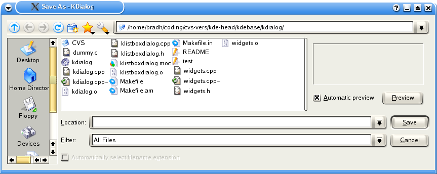 This section covers dialogs to select files to open and save. These dialogs access the power of the underlying KDE dialogs, including advanced filtering techniques and can provide either paths or URLs.