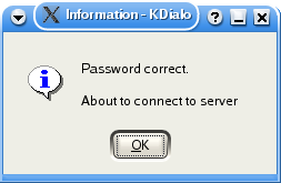 kdialog --msgbox "Password correct.\n About to connect to server" |