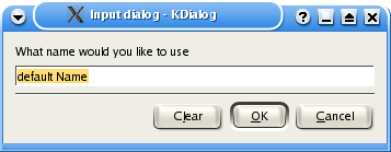 kdialog --title "Input dialog" --inputbox "What name would you like to use" "default Name" |