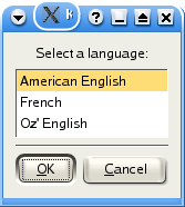 kdialog --menu "Select a language:" a "American English" b French d "Oz' English" |