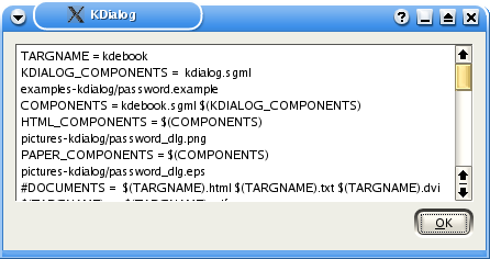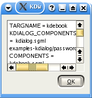 A common requirement for shell scripts is the ability to display a file. kdialog supports this with the --textbox dialog type. This dialog type has one mandatory parameter, which is the name of the file to be displayed. There are also two optional parameters which specify the width and height of the dialog box in pixels. If these are not specified, 100 pixels by 100 pixels is used.