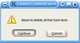 kdialog --title "Example ContinueCancel warning dialog" \ --warningcontinuecancel "Are you sure you want to delete all that \ hard work?" |