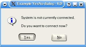 kdialog --title "Example YesNo dialog" --yesno "System is not \ currently connected.\n Do you want to connect now?" |