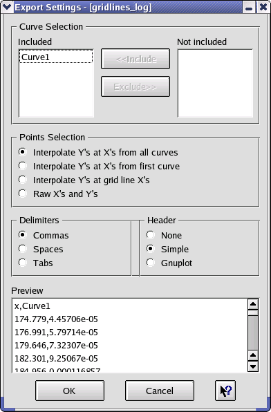 The curves are exported as a set of points. The user may control which points are exported. X values from all curves, just the first curve, or from the grid lines may be selected, and corresponding Y values will be calculated. The raw X and Y values can also be selected, although this format is typically less useful to other applications.