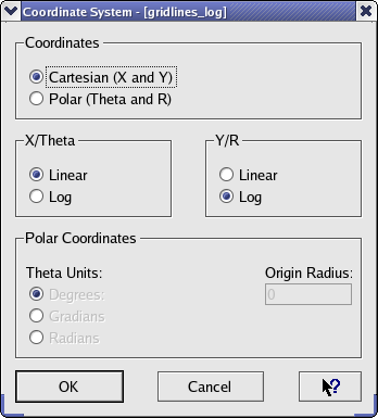 The coordinates dialog is used to select other coordinate systems. The coordinates may be polar (Angle and Radius) rather than cartesian. The coordinates may also be logarithmic rather than linear.