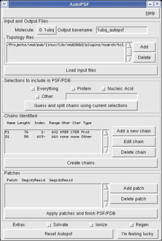 AutoPSF acts on exactly one currently loaded input pdb file, specified by the Molecule pulldown menu. The output files will have prefixes specified by Output basename. You may specify one or more topology files in the Topology files menu; a sensible default file is provided, but you will need to include others if you have nonstandard residues in your structure.
