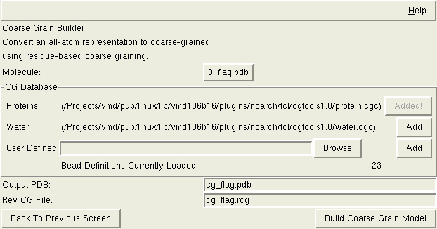 To be able to properly return to an all-atom representation, CG Builder will needs a work file that is a 'Reverse Coarse Graining File'. Again, a sample filename is given. The important thing is that this file isn't lost, because it will be needed when you want to convert the coarse-grained system back to the all-atom representation.