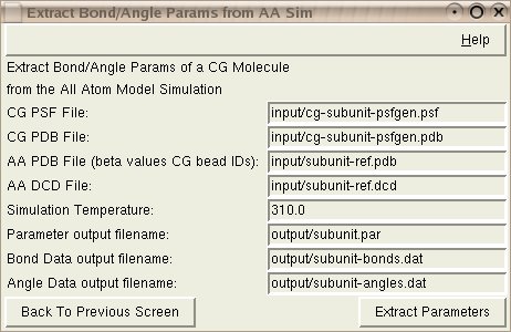 Output: The Angle Data output filename doesn't contain additional information above what the output parameter file contains. It just doesn't have all of the extra comments that a parameter file typically has. If you do multiple short all-atom trajectories you can run this option on each trajectory. The bond/angle files can be used to compare the calculated parameters across these trajectories. (xmgrace works well on these files)