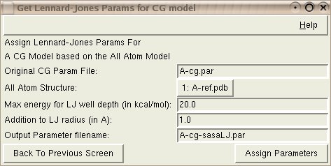 This tool extracts solvent accessible surface area (SASA) for each atomic domain representing a CG bead from an all-atom structure corresponding to the CG structure. The values extracted are SASA for the whole domain (in the context of the rest of the structure) and SASA for hydrophobic residues only. These values are used to assign the LJ well depths Ei to individual CG beads, as Ei = ELJ * (SASAi[hydrophobic]/SASAi[total])2, where ELJ is an adjustable constant. Radius of gyration is used to compute LJ radii; LJ radius Ri is obtained as Ri = r_gyri + RLJ, where r_gyri is the radius of gyration for all atoms represented by the ith CG bead and RLJ is an adjustable constant.