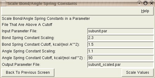 Input: The Bond/Angle Spring Constant Scaling is the multiplier that you want applied to the bond/angle spring constants in the file. If you have a value of 1 here, the constants will not be modified. If you have a value of 2, the constants will be doubled (see cutoff, below).