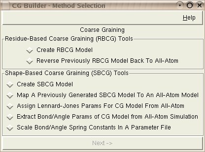 However, when using the residue-based coarse-graining in the CG Builder, one does not have to follow the sample CG scheme. As explained below, one can create arbitrary definitions of which atoms correspond to which CG bead, and use those to create their own RBCG models with the CG Builder.