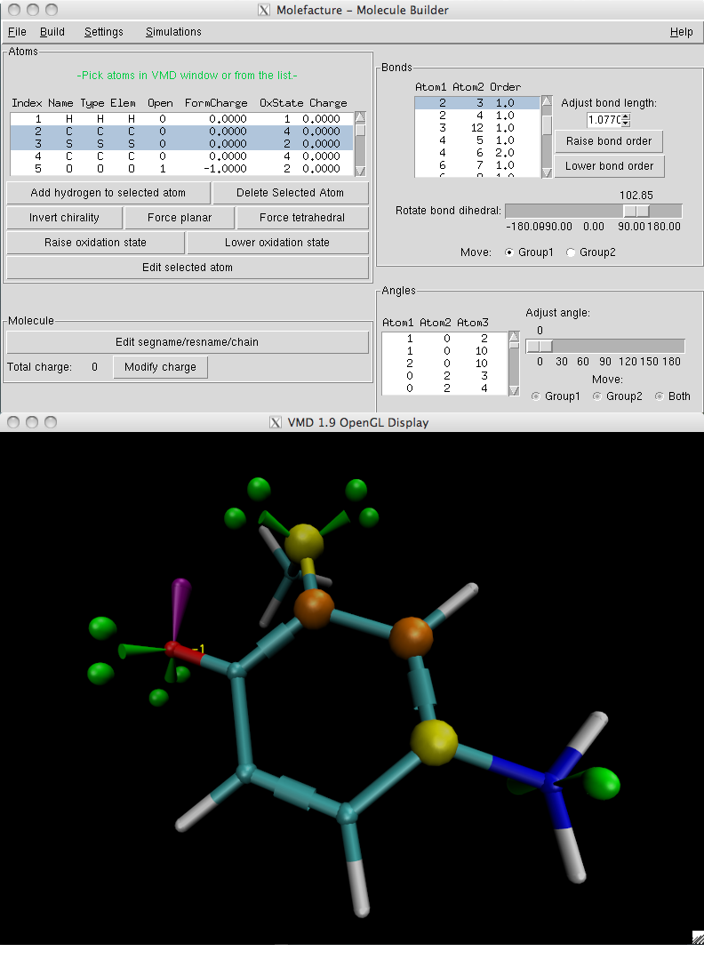 Most operations in molefacture act on one or more picked atoms, indicated by orange spheres. To enter the molefacture pick mode in the VMD OpenGL window, press p on the keyboard (molefacture automatically begins in this mode; it is only necessary to re-enter it if other mouse modes are used). Atoms can be selected either by clicking on them in the list in the molefacture GUI or directly in the OpenGL window. Shift-clicking in the OpenGL window allows the selection of multiple atoms.