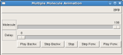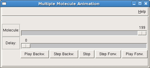 The graphical user interface has two horizontal sliders where you can navigate to an individual frame (='molecule') and set the delay between displaying two consecutive frames/molecules. The set of buttons below allows to run the animation forward or backwards in continuous loops or with single stepping.