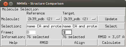 This interface lists molecules available for comparison. If all molecules loaded in VMD are not displayed, click . User needs to make a selections for both molecules that will result in selecting the same number of atoms. NMWiz will generate arrows between atoms in these selections.
