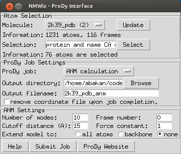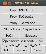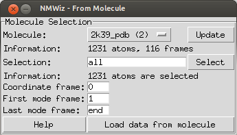 ProDy interface lists molecules available for calculations. If all molecules loaded in VMD are not displayed, click . ANM and GNM calculations require a coordinate set. PCA calculations require multiple coordinate sets. If coordinate sets are aligned, this can be specified and ProDy calculations will take shorter to complete. Note that you can perform atomistic calculations by changing the atom selection. If you perform atomistic ANM or GNM calculations adjust the cutoff distance parameter accordingly. Upon completion of the calculations, NMWiz automatically loads the results.