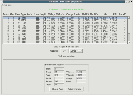 Now that your model compound has been determined, you can already set many atom based properties. Use "Edit->Atom properties" to open the appropriate interface. You'll see a list of properties for each atom from which you can select single or multiple atoms to edit them using the entry fields at the bottom of the window. There are three ways of selecting atoms. 1) You can directly click on atoms in the OpenGL window, the atom becomes marked with an orange sphere and seleccted in the listbox. Holding the shift key while picking adds the atom to the selection rather that replacing it. 2) You can select atoms from the list using the mouse or the arrow keys. Dragging or shift selects contiguous groups from the list, holding the control key allows to select arbitrary atoms. 3) You can use VMD's atom selection language.