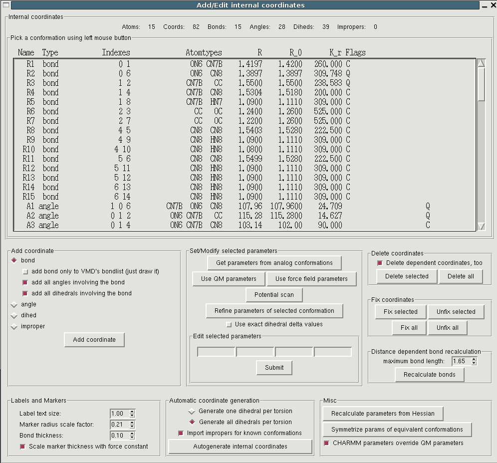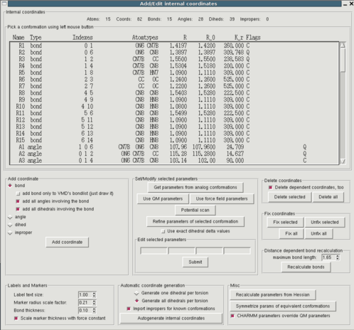 Before bonded parameters can be assigned it has to be specified for which internal coordinates, i.e. bonds, angles, dihedrals and impropers bonded interactions must be determined. For each of these coordinates parameters for bonded interaction will either be taken from existing model compounds, or, in case no equivalent exists, be derived from the Hessian matrix (see below). "Edit->Intenal coordinates" opens a window containing a (initially empty) list of defined internal coordinates and a plethora of buttons. A good starting point is to autogenerate the internal coordinates. In this procedure all covalent bonds of a molecule (as displayed in VMD) are defined as bonds. Then all possible angles and dihedrals that can be constructed from the given bonds are generated. In many cases this is already sufficient but you can add and delete arbitrary coordinates. You can for example add impropers to stabilize planar geometries. More info about the choice of internal coordinates can be found here. Note: After you have generated internal coordinates you can already write valid topology files using the accordant button in the main window.