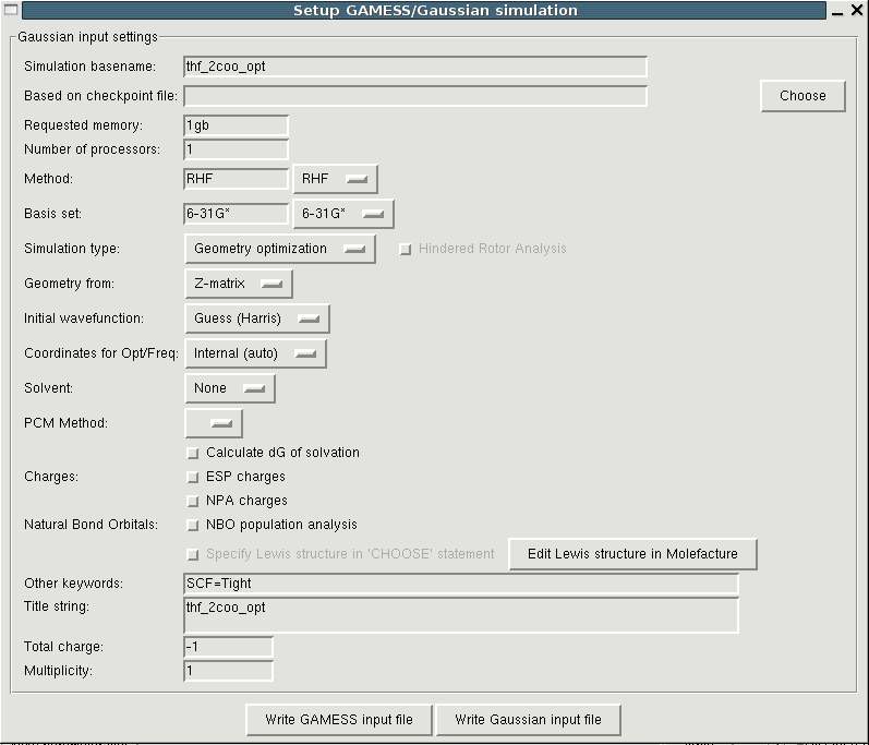 Based on the optimized geometry another QM calculation has to be performed. (In future versions these two steps might be merged). Choose "Hessian->Setup QM single point calc. (Hessian, charges)" to open the same form as for the QM optimization but now with different default values. Again, after writing the setup file you must run the simulation manually and subsequently load the logfile using the appropriate entry in the "File" menu.