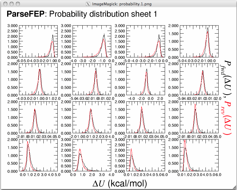 ParseFEP consists of a set of tools for the analysis of free-energy perturbation (FEP) calculations carried out within NAMD. FEP estimator. Based on the output file of an FEP calculation, i.e. the alchOutFile file, ParseFEP computes the free-energy difference and provides an estimate of the statistical error. Bidirectional FEP calculations. If the transformation is performed bidirectionally (1), the results of the forward and the backward simulations can be combined in the form of the simple-overlap sampling (SOS) estimator, or the Bennett acceptance-ratio (BAR) estimator (2) of the free energy. For each approach, an estimator of the statistical error is supplied. Because combination of the statistical data accrued in bidirectional FEP calculations reduces the variance, it is recommended to carry out the simulation in both the forward and the backward directions. The BAR estimator corresponds to the maximum-likelihood value of the free energy and is obtained self-consistently, using as an initial guess the result of the FEP calculation. Pictorial representation. For unidirectional FEP calculations, ParseFEP provides a graphical representation of the underlying probability distribution, the Boltzmann weight, and the product of the two. For bidirectional FEP calculations, ParseFEP displays the probability distributions characterizing the forward and the backward transformations. These distibutions are shown for all the windows, or strata, found in the alchOutFile file. It is, therefore, assumed that the output files for the FEP calculations performed in the two directions contain the same number of intermediate states. Comprehensive error analysis. The error associated to free-energy estimates embraces contributions of different nature, a statistical component, namely the variance of the free-energy estimator, and a systematic component, that is, the bias arising from the finite length of the simulation. ParseFEP computes the variance for the three, i.e. FEP, SOS and BAR, free-energy estimators, thereby providing an assessment of the precision of the calculation. In addition, it estimates the bias as the relative inaccuracy of the free-energy calculation, based on the degree of overlap of the underlying probability distributions (3). Monitoring the convergence. ParseFEP plots the evolution of the free energy as a function of the number of molecular-dynamics steps. Only the information utilized towards the estimation of the free-energy difference, i.e. past alchEquilSteps, is displayed. In the case of bidirectional FEP calculations, the evolution of the free energy is shown for both the forward and the backward transformations. Gram-Charlier interpolation. The statistical information accumulated in the alchOutFile file can be employed to model the underlying probability distribution. The latter can be described in terms of a product of a Gaussian distribution by a series of Hermite polynomials, i.e. a Gram-Charlier expansion (3). Convergence of the Gram-Charlier expansion at a given order represents a relevant measure of how well-defined the probability distribution is. Enthalpies and entropies. The perturbation formalism used to infer free-energy differences can be generalized for the determination of enthalpy and entropy differences (3). These estimates are inherently less accurate than those of the free energy, because they involve averages of the total energy and the computation of a difference of two, independently measured large numbers, subject to large fluctuations. Command-line user interface. ParseFEP can now be run in text mode, that is without its GUI, which may be useful for batch analyses of FEP calculations. This version of the plugin uses the very intuitive syntax — parsefep <option 1> <option 2> ..., with the following options: -forward <file name>: FEP alchOutFile file for the forward transformation, -entropy: Compute enthaply and entropy differences, -gc <max order>: Gram-Charlier expansion at a given order, -gauss: Gaussian approximation to model the underlying probability distribution, -backward <file name>: FEP alchOutFile file for the backward transformation, -<sos|bar>: use the SOS or BAR estimator. References (1) Pohorille, A.; Jarzynski, C.; Chipot, C. Good practices in free-energy calculations. J. Phys. Chem. B 2010, 114, 10235-10253. (2) Bennett, C. H. Efficient estimation of free energy differences from Monte Carlo data. J. Comp. Phys. 1976, 22, 245-268. (3) Chipot, C.; Pohorille, A. (Eds.) Free energy calculations. Theory and applications in chemistry and biology. Springer Verlag, 2007. Note. On platforms running a Unix-like operating system, it is assumed that XMGrace and ImageMagick (display) are installed for visualization purposes. On Windows platforms, use is made of the Multiplot plotting program. How to cite ParseFEP. Liu, P.; Dehez, F.; Cai, W.; Chipot, C. A toolkit for the analysis of free-energy perturbation calculations, J. Chem. Theor. Comput. 2012, 8, 2606-2616. Contributors. Chris Chipot (chipot@illinois.edu) and Liu Peng (superdirac@gmail.com). |