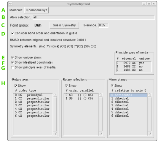 - (H) Lists of found symmetry elements. If you select an element in the list