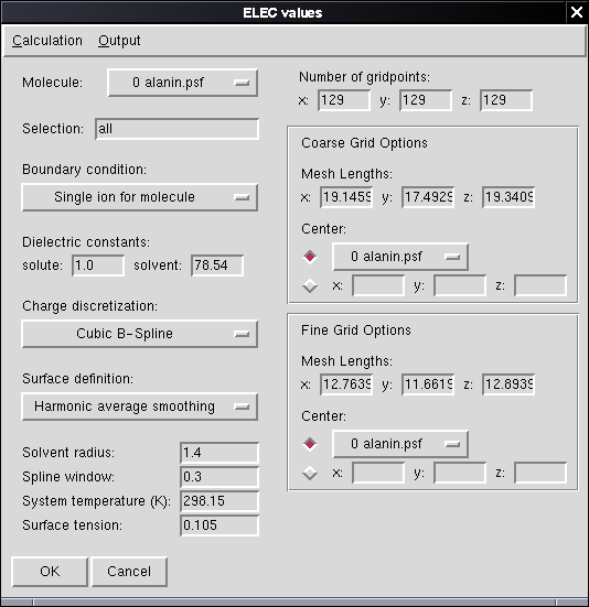 Options pertaining to a single Poisson-Boltzman equation are located in the ELEC Window. Since APBS does not provide default values for any of the required fields, the plugin does its best to fill in appropriate numbers. More information about APBS ELEC statements can be found in the APBS Documentation. Remember that the plugin does not yet support the fields newly available in APBS 0.3.0.