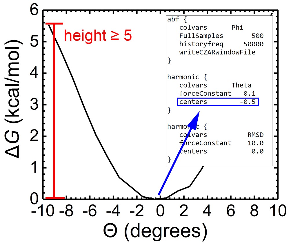 Figure 2. Example PMF for Eular angle Θ. ΔG(max)-ΔG(min) ≥ 5 kcal/mol is highly suggested in simulation describing RMSD and angles. The center of the harmonic restraints of Euler and spherical angles (Note: excluding RMSD) should be tailored according to the corresponding free-energy landscape.