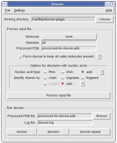 The Dowser plugin can be used to process a pdb file for use with Dowser, a program that finds cavities in proteins and solvates them according to an energy criterium. You will need to install Dowser yourself. Please refer to the Dowser manual. In the instructions you will find that you need to source 'dowserinit' before running dowser.