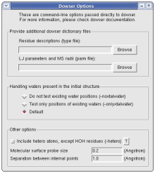 Include hetero atoms (-hetero): hetero atoms (HETATM records in the PDB file) will be included, with the exception of crystallographic water molecules identified as having atom name "O" and residue name "HOH". (The default is to use only ATOM records.) Note that all HETATM records are converted to ATOM by VMD, so if you do not want these atoms to be included, delete them from the input PDB before you start using the Dowser plugin.