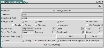 The only required inputs to NAMDEnergy are one selection, and the type of energy to be calculated. A number of optional parameters are available both in the text interface and GUI; these are: