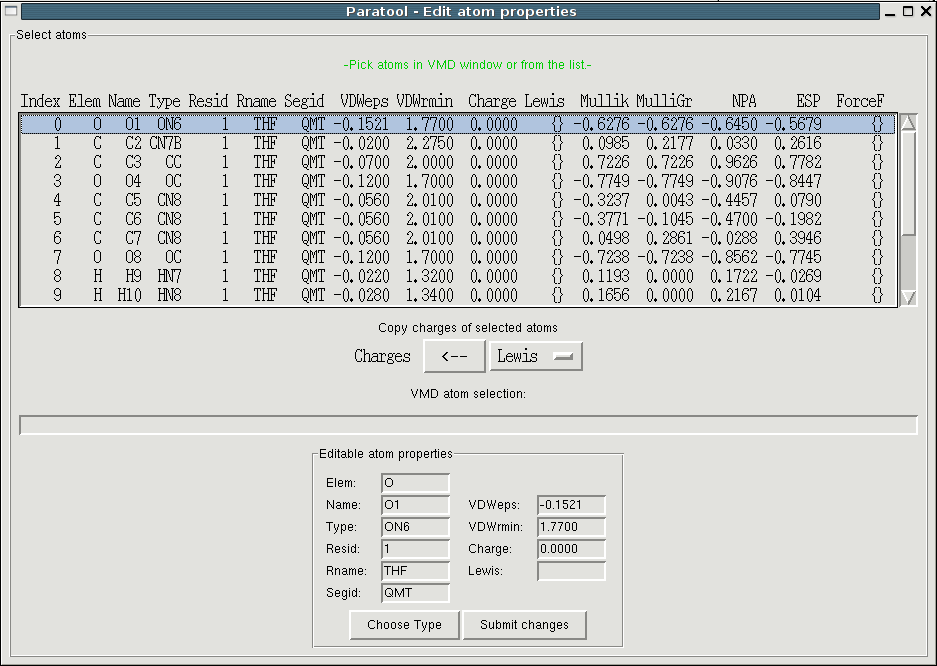 The plugin helps you to generate the molecule or the moleular fragment that should be parametrized and to set up the necessary quantumchemical calculations (you'll need Gaussian, later versions will also support GAMESS). Paratool reads the logfiles of the QM simulations, computes force field parameters for bonds, angles dihedrals and impropers by transforming the Hessian into internal coordinates and converting all values into units based on kcal/mol, Å and degrees. You can assign atom types and the corresponding VDW parameters from a list of already existing types or generates new types (all chemical elements H - Rn supported). The charges can be determined using restricted electrostatic potential fitting RESP (AMBER style) or CHARMM style charges using their supramolecular approach which requires another Gaussian calculation.