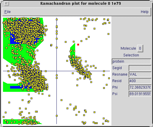 After loading a molecule, using the pulldown menu in the upper right part of the window to choose a molecule. Protein residues in the current molecule are mapped to the Ramachandran diagram with yellow squares. Clicking on a square causes the square to turn red, displays residue information in the fields on the right side of the window, and, if trajectory data is present, draws the location of the selected residue in Ramachandran space for all frames in the trajectory as empty black squares. Clicking one of the empty squares causes VMD to redraw the graphics display window with coordinates from the timestep corresponding to that square. Clicking a second time on a red highlighted residue switches off the trajectory information in the RamaPlot window.