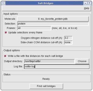 The Salt Bridges plugin searches for salt bridges formed in a protein throughout a trajectory. The search can be restricted to a selection and/or a frame range given by the user.